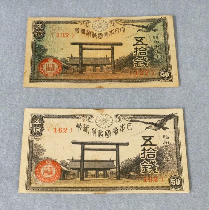 写真の五十銭紙幣は、上が1944年発行、下は1945年に発行されたもの。橋本博文名誉教授に「何が違うと思いますか?」と問われ、一瞬戸惑った。よく見ると、色合いが異なることに気がついた。