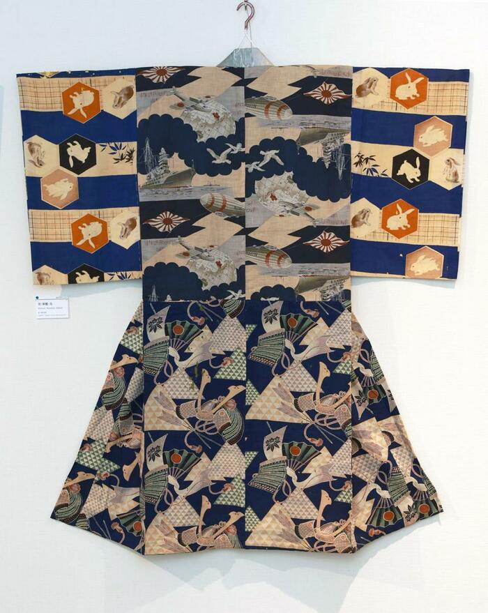 着物の前面と背面を覆う部分には、軍艦や戦闘機、かぶとなどがデザインされている。戦争をイメージさせるモチーフに紛れ、袖にはかわいらしいウサギがあしらわれていて目を引いた。