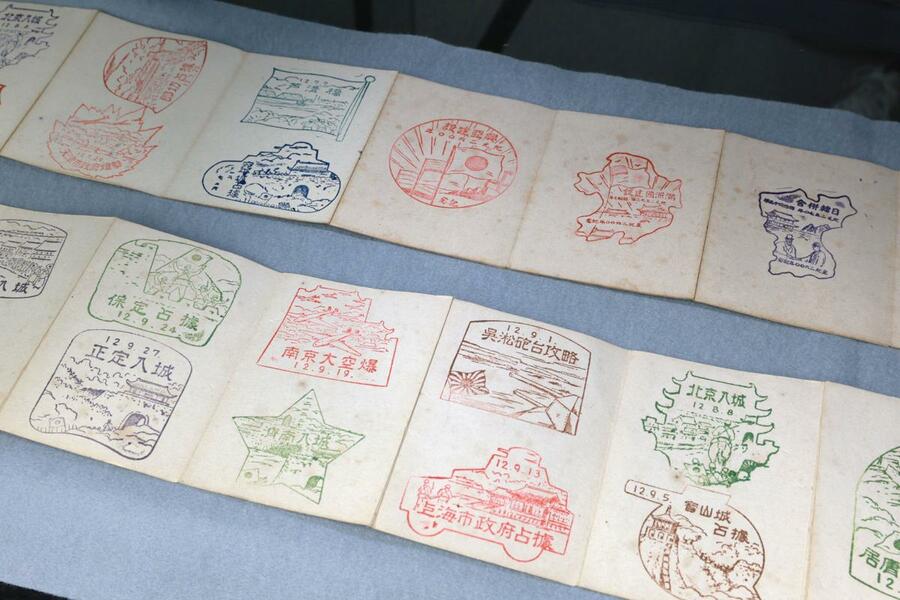 メダル(軍隊の勲章)や戦車などをモチーフにしたスタンプに「北京入城」「上海市政府占拠」など日中戦争の戦績が記されている。