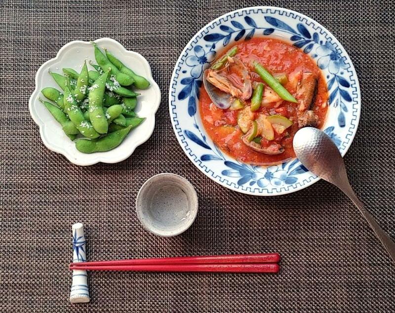 「さかきん発酵鍋」のレシピを参考にして、家庭でも手軽にできる肴を作ってみよう。夏なので、トマトベースのスープに。いうなれば和風のブイヤベース。野菜と魚介類を入れ、酒粕や塩こうじで味付けしたらうまそうだ。