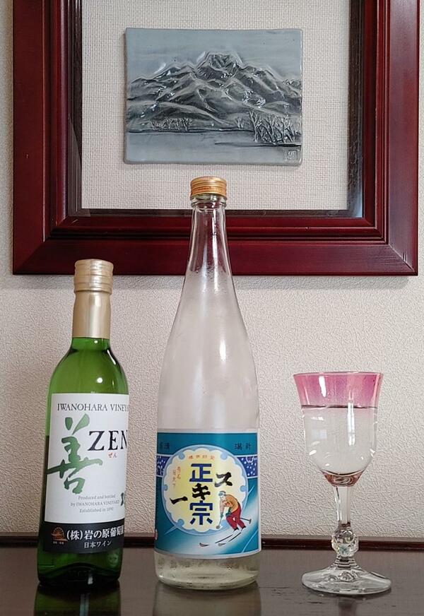 左から岩の原ワイン「善」白、武蔵野酒造の「スキー正宗」。いずれも坂口博士とゆかりが深い