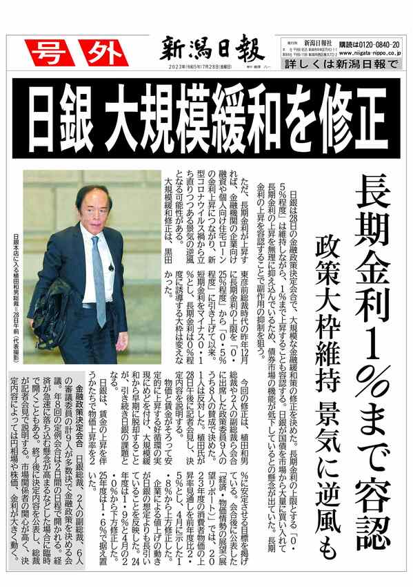 【号外】日銀、大規模金融緩和を修正 2023/7/28 13:35 (最終更新: 2023/11/17 10:38) PDFで見る トップページで最新情報を見る 関連ニュース 【政治コラム・永田町天地人】首相の進退 覚悟なき「石破降ろし... 2025/8/26 [コラム・キャスターEYE]<「大きな言葉」>惑わされず目凝... 2025/8/19 【政治コラム・永田町天地人】石破降ろし “辞めない首相”は強... 2025/7/29 [政治コラム・永田町天地人]細川護熙元首相 多くの人材と戒め... 2025/6/24 [コラム・キャスターEYE]<自由の伝道師>対話重んじたメル... 2025/6/18 [政治コラム・永田町天地人]農相交代 コメは最大の選挙対策 ... 2025/5/27 [政治コラム・永田町天地人]コメ輸入問題 石破政権に大きな試... 2025/4/29 [コラム・キャスターEYE]<トランプ関税>教科書に載る歴史... 2025/4/22 【速報】韓国大統領を罷免、尹錫悦氏は即時失職 2025/4/4 [政治コラム・永田町天地人]商品券配布問題 首相の雄弁さがあ... 2025/3/25 [政治コラム・永田町天地人]岐路の連立政権 自民公明の間に隙... 2025/2/25 [コラム・キャスターEYE]<トランプ現象>民主主義 まさに... 2025/2/18