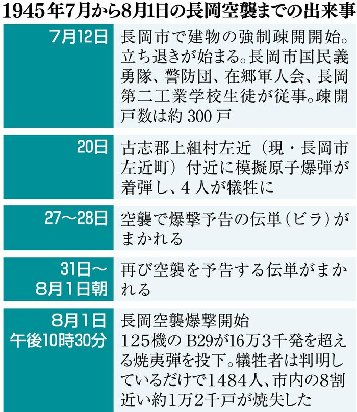空襲は午後10時半に始まり、翌2日午前0時10分まで続いた。米軍の爆撃機のB29が125機飛来。16万3千発以上の焼夷(しょうい)弾を投下した。犠牲者は前の月にあった模擬原爆投下による4人を含め、判明しているだけでも1488人に上る。