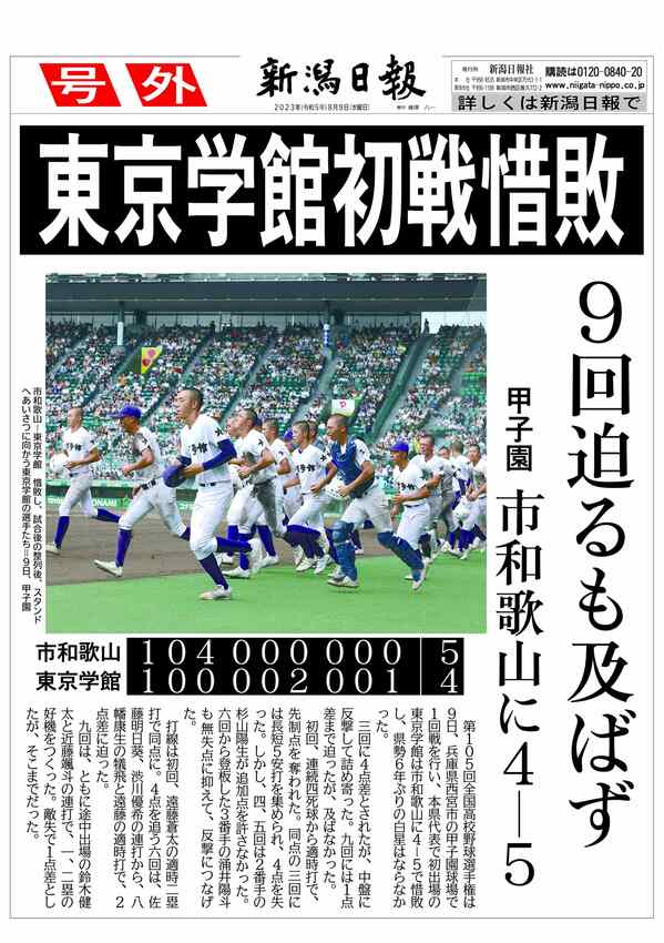 【号外】東京学館惜敗、甲子園初勝利ならず 市立和歌山に4-5、高校野球・夏の甲子園大会 2023/8/9 17:43 (最終更新: 2023/11/17 10:37) PDFで見る トップページで最新情報を見る 関連ニュース [高校野球]日本学生野球協会が2025年度の表彰選手発表!新... 1/20 [PL学園野球部創部70年]落日の名門、復活遠く オイシ桑田... 1/19 十日町高校の甲子園出場から25年…若井聡監督(六日町高校)が... 1/3 新潟産業大学付高校野球部・吉野公浩監督が柏崎市で講演 夏の甲... 2025/12/21 [高校野球]センバツ21世紀枠、六日町は選外 全国9地区の2... 2025/12/12 センバツ21世紀枠候補校の六日町高校(南魚沼市)、県高野連が... 2025/12/5 【明治神宮野球大会高校の部】帝京長岡の工藤壱朗「まだ力不足」... 2025/11/14 【明治神宮野球大会高校の部】帝京長岡“初の全国”は惜しくも初... 2025/11/14 [明治神宮野球大会高校の部]14日の開幕戦に登場の帝京長岡、... 2025/11/12 来春のセンバツ21世紀枠、新潟県推薦校に六日町高校 2025/11/12 [明治神宮野球大会高校の部]新潟県勢全戦績まとめ 県勢が持つ... 2025/11/12 イチローさん“思い出”の悠久山で柵越え!中越高球児らにイチ流... 2025/11/9