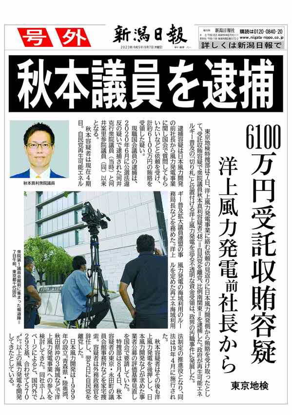 【号外】秋本真利衆議院議員を逮捕、6100万円受託収賄容疑 2023/9/7 12:45 (最終更新: 2023/11/17 10:35) PDFで号外を見る トップページで最新情報を見る 関連ニュース 新潟県含む1都10県で空き巣被害計約3900万円、外国人窃盗... 1/20 「税金納めるために現金必要」息子らになりすまし計1710万円... 1/20 【長岡住宅強盗】長岡市の76歳男を容疑で逮捕、領収書を書いて... 1/20 [聖籠町 殺人・死体遺棄事件]元リフォーム業者の被告、初公判... 1/20 8人の代金引換貨物の代金計20万円を着服、業務上横領の疑いで... 1/19 安全確認怠りパトカーで人身事故、県警の巡査を書類送検…相手は... 1/19 SNSで架空の副業に勧誘され95万円だまし取られる 小千谷市... 1/19 袋に入った現金2430万円詐取、佐渡署が容疑で38歳男逮捕 ... 1/17 308円相当の菓子盗んだ疑いで新潟市の公務員の男逮捕、燕署…... 1/17 「受け子」へ資金提供容疑で滋賀の大学生逮捕、新潟市北区の詐欺... 1/16 新潟県警が誤認逮捕を発表し謝罪 長岡市の不同意わいせつ容疑、... 1/16 三条市で路線バスが歩いていた60代男性と接触 1/15