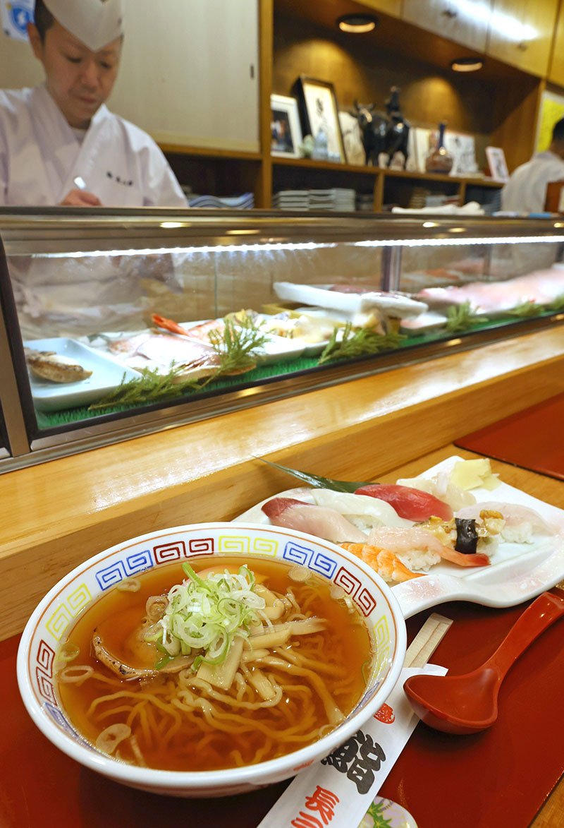 のれんをくぐると、メニュー表には、握りずしやちらしずしに併せ「中華そば」「タンメン」などが並ぶ。すしを頼まず、ラーメンのみ単品で注文する人も多い。