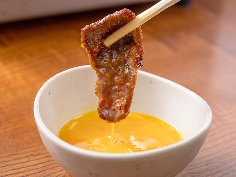 その間に準備するのが、溶き卵。そう、焼き上がった肉を卵に潜らせていただく、すき焼きスタイルがこの店の流儀になっている。「お父さんと私で一所懸命考えた」と嶋津さん。