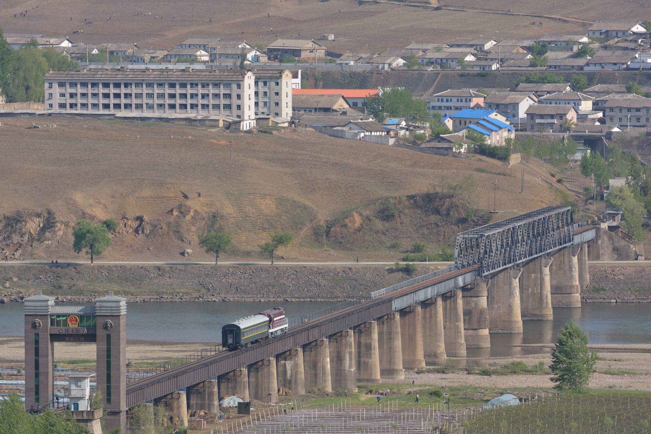 中国集安から北朝鮮満浦に向かう。たった1両の国際列車は鉄橋を渡り、北...