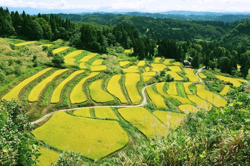 まるで山の中に描かれた絵画のような美しさだ。小千谷市岩沢地区の外之沢(そでのさわ)の棚田。収穫前の9月上旬、田んぼは豊かに実った稲穂が浮き上がって見えた。