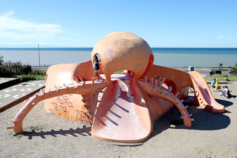「タコ公園」。新潟市の関屋分水路脇にある関分記念公園(中央区)は、利用する市民から親しみを込め、こう呼ばれている。愛称の由来は、砂場にたたずむタコの形をした大型の滑り台。カニやクラゲ、イルカなどの置物もあり、海中の遊び場のような雰囲気だ。