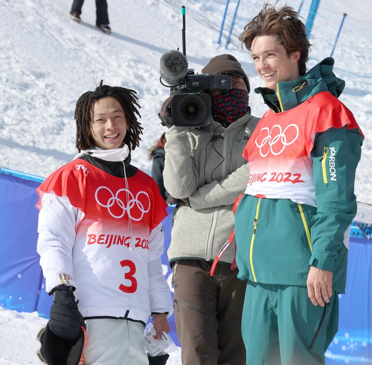 逆転で金メダルを勝ち取った平野歩夢選手(左)と銀メダルのスコット・ジェームズ選手