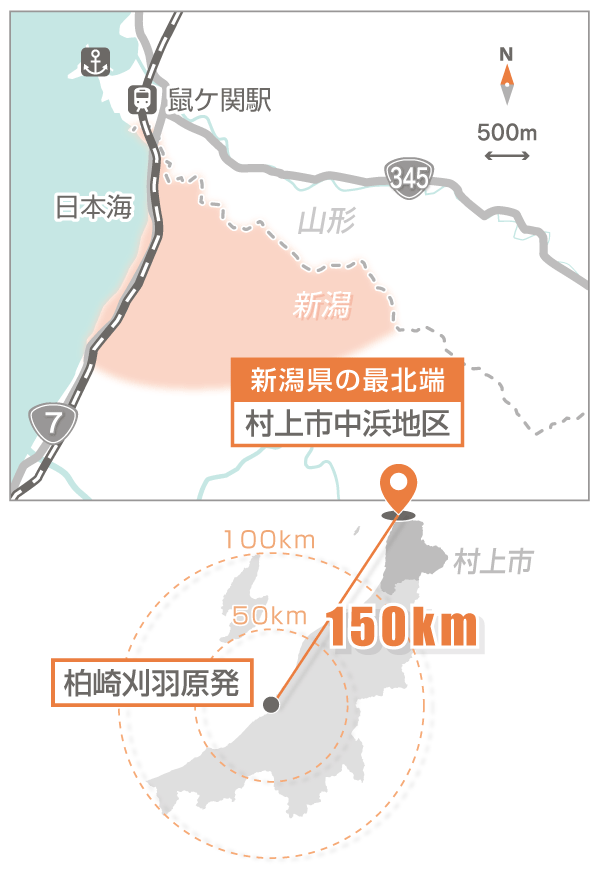 世界史上最悪レベル原子力発電所などの事故・トラブルについて、安全上どの程度のものかを表す国際的な指標がある。INES(国際原子力・放射線事象評価尺度)と呼ばれるもので、0~7までの8段階で評価する。福島第1原発事故は「最も深刻な事故」を示す「レベル7」と暫定的に評価されている。1986年に旧ソ連で起きたチェルノブイリ原発事故も「レベル7」と評価されている。となる東京電力福島第1原発事故2011年3月11日に発生した東日本大震災の地震と津波で、東電福島第1原発(福島県大熊町、双葉町)の6基のうち1~5号機で全交流電源が喪失し、1~3号機で炉心溶融(メルトダウン)が起きた。1、3、4号機は水素爆発し、大量の放射性物質が放出された。後、新潟県柏崎市日本海に面した新潟県の自治体の一つ。中越地域に属する。新潟市までは約84キロ。人口はおよそ7万9000人で、新潟県内で6番目に多い(住民基本台帳に基づく2023年1月1日現在の数字)。2005年に西山町、高柳町を編入した。と刈羽村新潟県内の自治体の一つ。飛び地以外の区域は柏崎市に囲まれている。人口はおよそ4350人で、新潟県内では2番目に少ない(住民基本台帳に基づく2023年1月1日現在の数字)。にまたがって立地する東電柏崎刈羽原発1985年に1号機が営業運転を開始した。全7基の出力合計は821・2万キロワットで世界最大級だが、2023年10月現在は全基停止中。東京電力は2013年に原子力規制委員会に6、7号機の審査を申請し、17年に合格した。その後、テロ対策上の重大な不備が相次いで発覚した。終了したはずだった安全対策工事が未完了だった問題も分かった。は、全7基が停止したままだ。福島事故を起こした東電が運営する柏崎刈羽原発の動向は、国内外の注目を集める。柏崎刈羽原発で事故が起きれば、被害は新潟県全域に及ぶ可能性が十分にある。あえて原発から離れた地域を歩き、県民に原発への思いを聞く取材を始める。振り出しは新潟県の最北端、山形県境に位置する村上市中浜地区から。(論説編集委員・仲屋淳)=2回続きの2回目=
