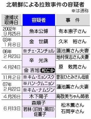 韓国から死亡情報が寄せられた金吉旭容疑者は、1928年に生まれた。大阪の朝鮮学校長を辞めた後の76年ごろ、北朝鮮工作員だった辛光洙容疑者の協力者に。77年に韓国籍を取得し、対南工作に従事した。80年6月、貿易会社の採用面接名目で大阪市の中華料理店員だった原敕晁1980年6月中旬に宮崎県内で失踪。北朝鮮は49歳で「肝硬変で死亡」と主張。84年に拉致被害者の田口八重子さん結婚したと北朝鮮は説明しているが、86年7月ごろまで田口さんと同じ招待所(拉致被害者や工作員が過ごす施設)にいた拉致被害者は結婚の事実はなかったと証言している。さん=失踪当時(43)=を呼び出した際、辛容疑者と共...