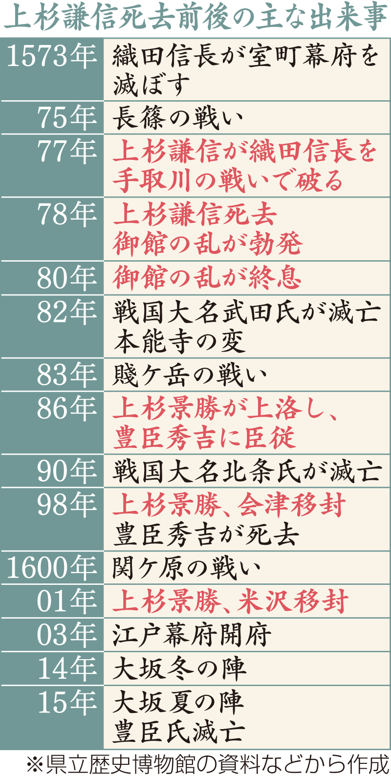 越後のヒーローが長生きしていたら-。「毘」の旗を掲げて君臨を続け、領国の拡大、天下も視野に入っていただろうか。さらには、その後に発生した国内のさまざまな出来事も、違った結果だったかもしれない。