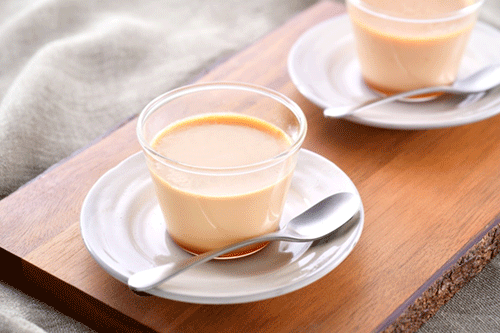 - 器に[1]のカラメルソースを均等に入れ、その上に ④ のプリン液を入れて表面の泡を取り除く。