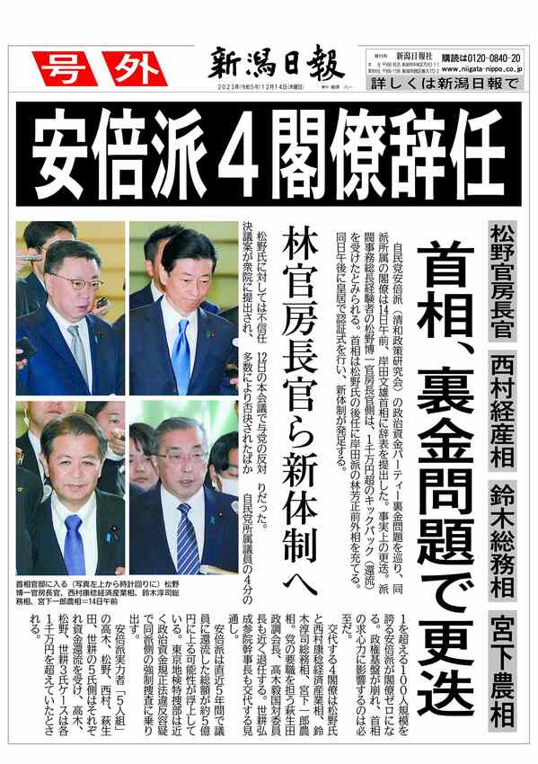 【号外】自民党安倍派4閣僚辞任、裏金問題で更迭 2023/12/14 11:30 (最終更新: 2023/12/14 11:37) PDFで号外を見る トップページで最新情報を見る 関連ニュース 【政治コラム・永田町天地人】首相の進退 覚悟なき「石破降ろし... 2025/8/26 [コラム・キャスターEYE]<「大きな言葉」>惑わされず目凝... 2025/8/19 【政治コラム・永田町天地人】石破降ろし “辞めない首相”は強... 2025/7/29 [政治コラム・永田町天地人]細川護熙元首相 多くの人材と戒め... 2025/6/24 [コラム・キャスターEYE]<自由の伝道師>対話重んじたメル... 2025/6/18 [政治コラム・永田町天地人]農相交代 コメは最大の選挙対策 ... 2025/5/27 [政治コラム・永田町天地人]コメ輸入問題 石破政権に大きな試... 2025/4/29 [コラム・キャスターEYE]<トランプ関税>教科書に載る歴史... 2025/4/22 【速報】韓国大統領を罷免、尹錫悦氏は即時失職 2025/4/4 [政治コラム・永田町天地人]商品券配布問題 首相の雄弁さがあ... 2025/3/25 [政治コラム・永田町天地人]岐路の連立政権 自民公明の間に隙... 2025/2/25 [コラム・キャスターEYE]<トランプ現象>民主主義 まさに... 2025/2/18