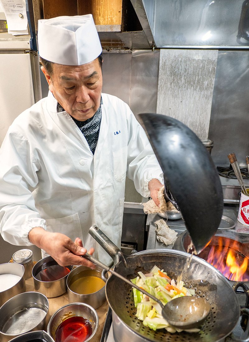 当時から人気の五目そばの具材は、豚肉、エビ、ウズラ、にんじん、タケノコ、キクラゲ、いか、小松菜、キャベツ、白菜、豚の腎臓。小松菜以外を油通しし、中華鍋へ。ここに小松菜も加え、油をまとわせていく。