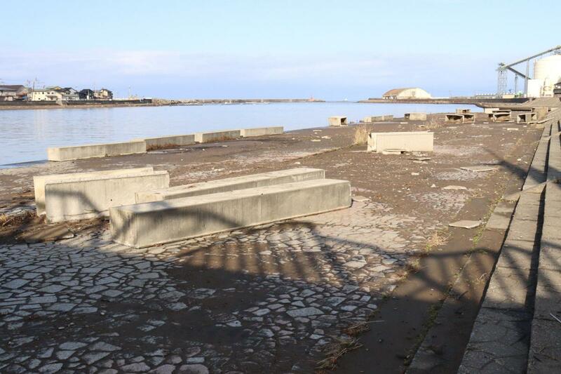 津波に押し流された構造物=1月2日、上越市川原町の関川河口付近