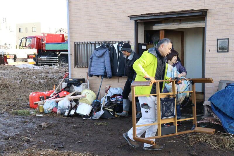 関川河口付近の住宅街で、津波によって流された堆積物の片付けに追われる住民ら=1月2日、上越市港町1