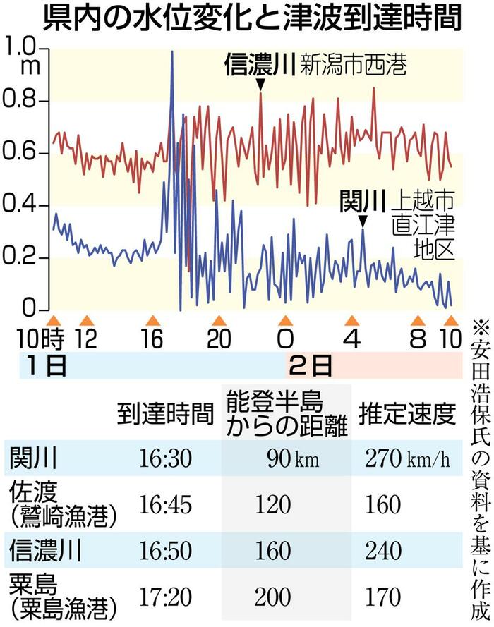午後4時(16時)10分ごろの地震発生から、関川に津波が到達したのは約20分後で、水位は約40センチ上昇した。信濃川でも午後4時50分ごろに30〜40センチの水位変化があった。津波は能登半島から信濃川までの距離約160キロを、推定時速240キロと新幹線並みのスピードで移動していた。