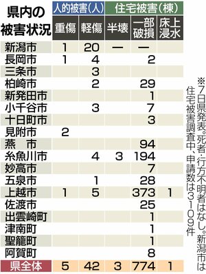 新潟によると、新潟市以外の市町村は柏崎市で初めて被害が判明するなどし、6日時点より45棟増え778棟となった。新潟市以外の新たな住宅被害の内訳は、柏崎市が29棟、燕市が14棟増の94棟、小千谷市が2棟増の7棟。