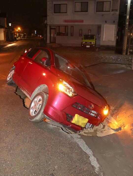 液状化とみられる現象で陥没する道路。軽自動車が動けなくなった=1月1日、新潟市西区鳥原(画像を一部加工)