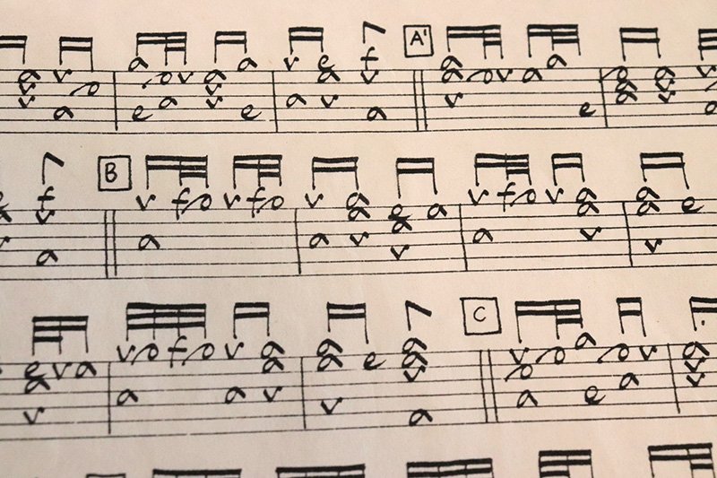 近くで見ると、胴体部分の木はとても薄い。サウンドホールには細かな模様が施され、美しい。ロゼッタと呼ばれるそうだ。弦が張られたネックの先のヘッドが折れ曲がっていて不思議な形だ。「きゃしゃでふくよかな音が魅力ですよ」。リュートの見た目に驚いていると、奥田さんが優しく解説してくれた。