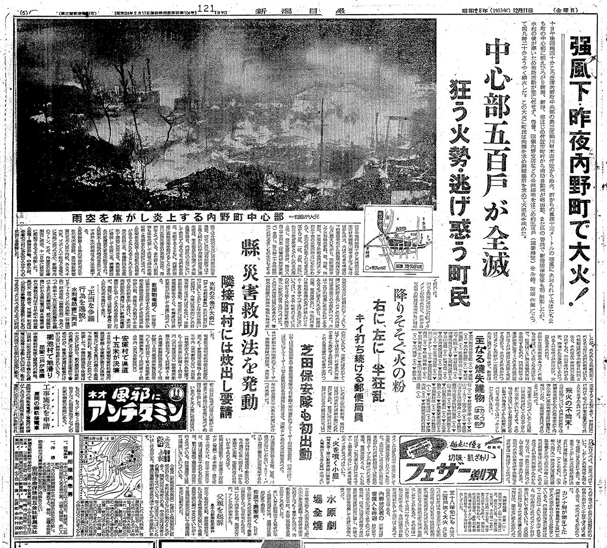 1953(昭和28)年12月10日、午後4時40分ごろ、旧西蒲原郡内野町(現新潟市西区内野町)の材木店から出火した。火は、折からの強い西風にあおられ、またたく間に町の中心部に広がった。約5時間にわたり100戸以上を全焼した「内野大火」だ。