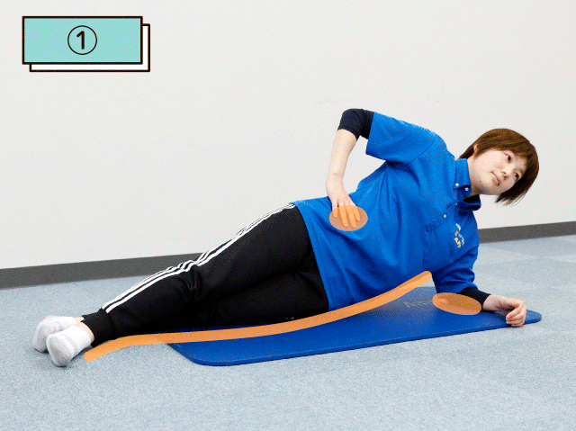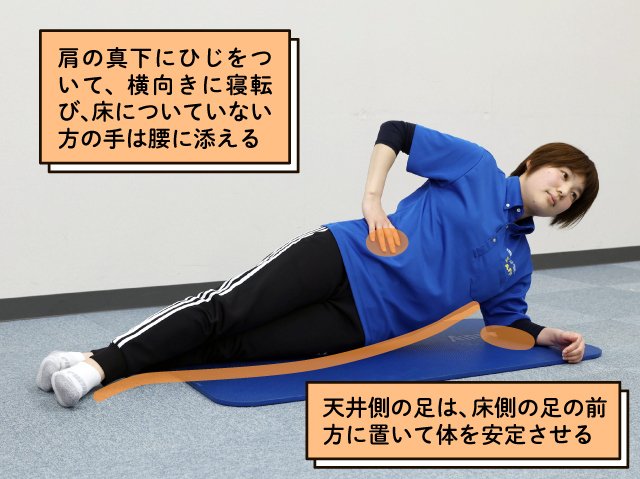 (1)肩の真下にひじをついて、横向きに寝転び、床についていない方の手は腰に添える。天井側の足は、床側の足の前方に置いて体を安定させる。