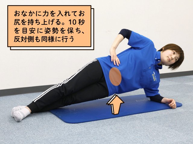 (2)おなかに力を入れてお尻を持ち上げる。10秒を目安に姿勢を保つ。反対側も同様に行う。