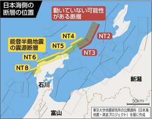 佐藤氏によると、能登半島側のNT8、NT6、NT5、NT4の断層が今回の震源断層に該当する=図参照=。東大地震研によると1・2〜4・1メートルほどの断層のずれ(地震によって断層が動いた距離=すべり量)があった。