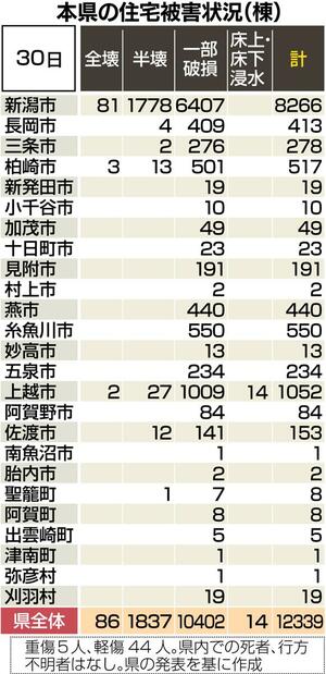 社会 地震・災害 能登半島地震 [能登半島地震]新潟県内の住宅被害1万2339棟、全壊は86棟に(1月30日時点) 2024/1/30 21:00 (最終更新: 2024/1/31 9:19) 能登半島地震による新潟県内の住宅被害は、新潟県のまとめによると、1月30日時点で1万2339棟となり、前日と比べて622棟増えた。県内全体で全壊86棟、半壊1837棟、一部破損1万402棟となった。 被害の大きい新潟市では全壊が計81棟となった。各区の内訳は西区71棟、中央区6棟、南区2棟、江南区と西蒲区で各1棟だった。新潟市に寄せられた罹災(りさい)証明書の申請件数は1万1222件。調査を終えたのは1万125件で1万件を超えた。 トップページで最新情報を見る 関連ニュース [能登半島地震2年]新潟市の再液状化対策見通せず…負担金や同... 2025/12/30 能登半島地震の被災者支援は、西堀ローサ跡地の再活用は…新潟市... 2025/12/24 能登半島地震の義援金受け付けを2027年3月31日まで延長 ... 2025/12/13 [能登半島地震]被災住宅の公費解体、事業完了を新潟市長に報告... 2025/12/9 「夕食難民」を救え! 地震で休業中、佐渡の老舗ホテルが和食居... 2025/12/4 能登半島地震の被災者、避難の教訓語る 糸魚川市で防災講演会 2025/12/3 [能登半島地震]新潟県内の住宅被害2万5415棟に・11月末時点 2025/11/29 [能登半島地震の液状化対策事業]新潟市が地質の詳細調査へ、関... 2025/11/26 [能登半島地震の液状化対策事業]新潟市が自治会別の説明会を開... 2025/11/17 ビニールハウスや車…避難所以外で生活送る被災者への支援強化 ... 2025/11/4 [能登半島地震]新潟県内の住宅被害2万5317棟に・10月末時点 2025/11/1 [能登半島地震の液状化対策事業]自治体単位の説明会、新潟市が... 2025/10/31