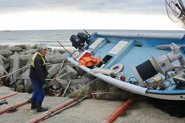 能登半島地震で発生した津波に流され、消波ブロックに乗り上げた漁船=1月2日、佐渡市羽茂地区