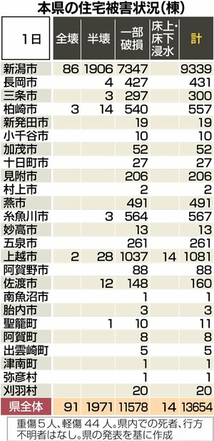 被害の大きい新潟市では計9339棟の被害が確認され、全壊は86棟、半壊は1906棟に上っている。市に寄せられた罹災(りさい)証明書の申請件数は1万1495件。調査を終えたのは1万1272件となった。