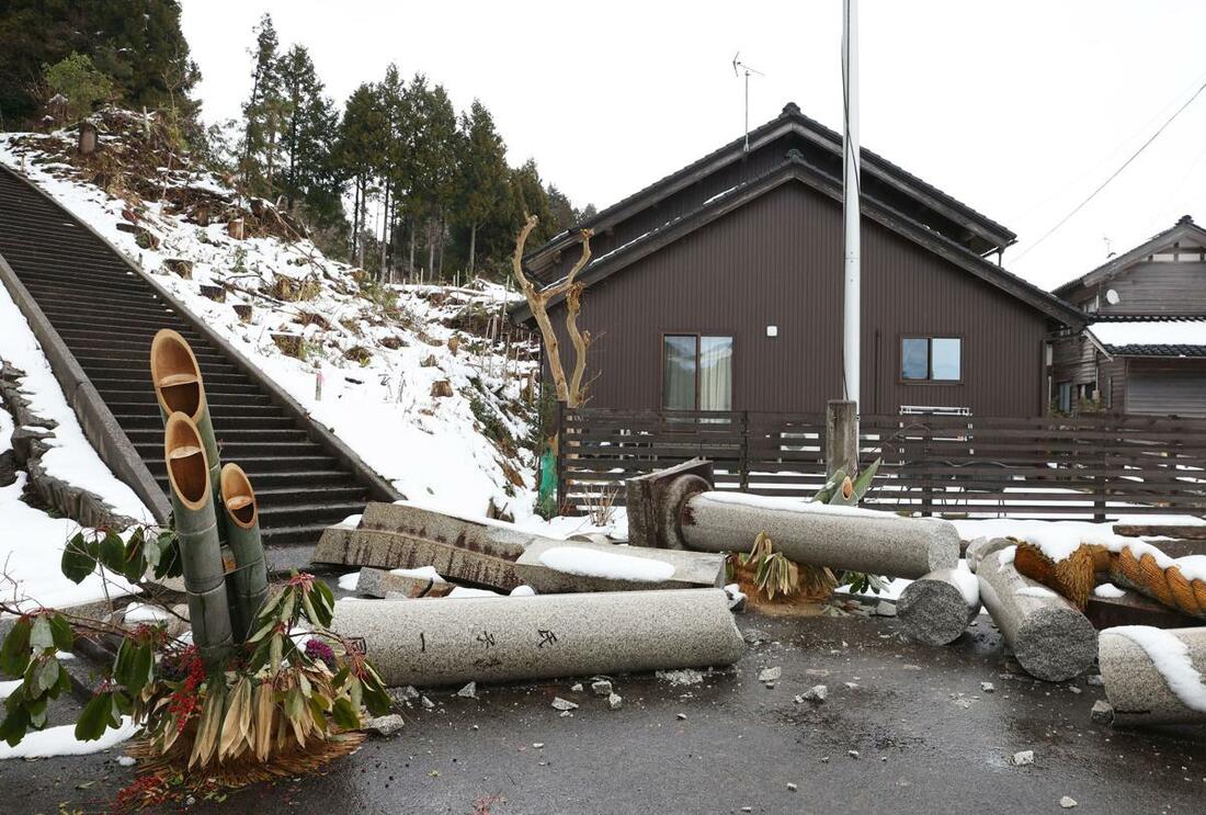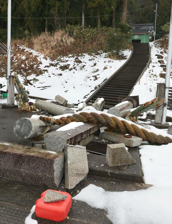 神社の鳥居は崩れ、痛々しい姿となっていました。門松の存在が元日の地震発生を物語っています。