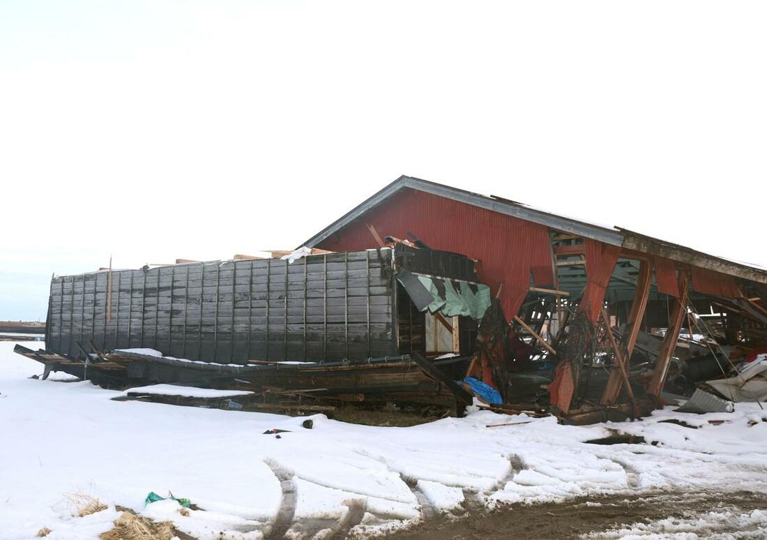 激しく損壊した建物。黒っぽい色の倉庫は逆さまに…。