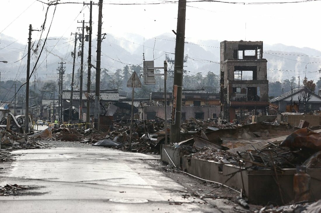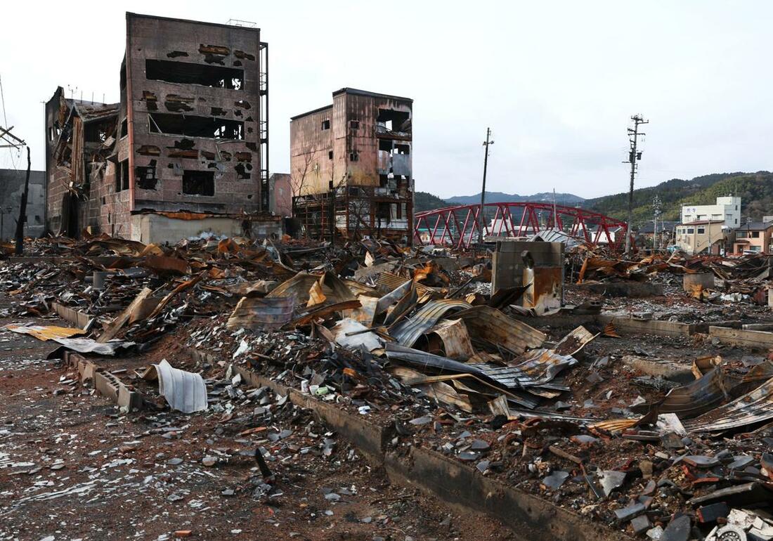 火災で焼失した観光名所の「輪島朝市」です。原形をとどめている建物はほとんどありません。