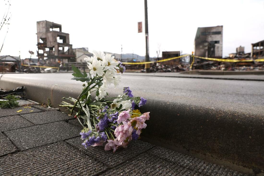 焦土と化した街の道端には、犠牲者を悼み花が手向けられていました。