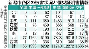 社会 能登半島地震 [能登半島地震]新潟市内の住宅被害1万棟超す、前日から287棟増加(2月4日時点) 2024/2/4 17:30 (最終更新: 2024/2/4 17:58) 能登半島地震による新潟市内の住宅被害は、同市のまとめによると、2月4日時点で計1万281棟となり、新潟市だけで1万棟を超えた。前日に比べ287棟増えた。 全壊は前日と変わらず86棟。半壊が23棟増え1993棟、一部損壊が264棟増え8202棟。罹災(りさい)証明書の申請件数は前日から54件増の1万1740件、交付件数は190件増えて1535件となった。 ※おことわり 能登半島地震の新潟県内の被害状況は、県が2月3日から土日祝日の発表をやめたため、新潟市が発表した被害状況を掲載します。 トップページで最新情報を見る 関連ニュース ビニールハウスや車…避難所以外で生活送る被災者への支援強化 ... 11/4 [能登半島地震]新潟県内の住宅被害2万5317棟に・10月末時点 11/1 [能登半島地震の液状化対策事業]自治体単位の説明会、新潟市が... 10/31 [能登半島地震の液状化対策事業]住民負担金巡り相次ぐ異論…全... 10/28 [能登半島地震の液状化対策事業]新潟市西区で全体説明会、住民... 10/11 [能登半島地震の液状化対策事業]生活保護世帯など負担金免除の... 10/8 [能登半島地震の液状化対策事業]費用の住民負担、全地権者への... 10/8 能登の巨大灯籠「キリコ」石川県輪島市井面集落から小千谷市に…... 10/7 [能登半島地震の液状化対策事業]「住民負担の軽減を」新潟市議... 10/7 [能登半島地震の液状化対策事業]世帯年収鑑み要件設定、負担軽... 10/1 [能登半島地震]新潟県内の住宅被害2万5279棟に・9月末時点 9/30 [能登半島地震の液状化対策事業]住民の同意得られなければ「中... 9/30
