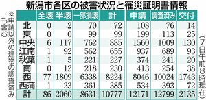 社会 能登半島地震 [能登半島地震]新潟県内の住宅被害1万5410棟、新潟市は1万777棟(2月7日時点) 2024/2/7 18:00 (最終更新: 2024/2/8 9:11) 能登半島地震による新潟県内の住宅被害は、県のまとめによると、2月7日時点で1万5410棟となり、前日に比べ227棟増えた。県内全体で全壊92棟、半壊2128棟、一部破損1万3176棟となった。 新潟市では計1万777棟の被害が確認され、全壊86棟、半壊2060棟、一部破損8631棟となった。市に寄せられた罹災(りさい)証明書の申請件数は1万2171件で、このうち交付されたのは2135件。住宅の被害認定調査を終えたのは1万2799件となった。 トップページで最新情報を見る 関連ニュース ビニールハウスや車…避難所以外で生活送る被災者への支援強化 ... 11/4 [能登半島地震]新潟県内の住宅被害2万5317棟に・10月末時点 11/1 [能登半島地震の液状化対策事業]自治体単位の説明会、新潟市が... 10/31 [能登半島地震の液状化対策事業]住民負担金巡り相次ぐ異論…全... 10/28 [能登半島地震の液状化対策事業]新潟市西区で全体説明会、住民... 10/11 [能登半島地震の液状化対策事業]生活保護世帯など負担金免除の... 10/8 [能登半島地震の液状化対策事業]費用の住民負担、全地権者への... 10/8 能登の巨大灯籠「キリコ」石川県輪島市井面集落から小千谷市に…... 10/7 [能登半島地震の液状化対策事業]「住民負担の軽減を」新潟市議... 10/7 [能登半島地震の液状化対策事業]世帯年収鑑み要件設定、負担軽... 10/1 [能登半島地震]新潟県内の住宅被害2万5279棟に・9月末時点 9/30 [能登半島地震の液状化対策事業]住民の同意得られなければ「中... 9/30