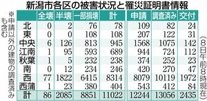 社会 地震・災害 能登半島地震 [能登半島地震]新潟県内の住宅被害1万5697棟、新潟市は1万1022棟(2月8日時点) 2024/2/8 19:00 能登半島地震による新潟県内の住宅被害は、県のまとめによると、2月8日時点で1万5697棟となり、前日に比べ287棟増えた。県内全体で全壊92棟、半壊2153棟、一部破損1万3438棟となった。 新潟市では1万1022棟の被害が確認され、全壊86棟、半壊2085棟、一部破損8851棟となった。市に寄せられた罹災(りさい)証明書の申請件数は1万2244件で、このうち交付したのは2435件。住宅の被害認定調査を終えたのは1万3056件となった。 トップページで最新情報を見る 関連ニュース [能登半島地震2年]新潟市の再液状化対策見通せず…負担金や同... 2025/12/30 能登半島地震の被災者支援は、西堀ローサ跡地の再活用は…新潟市... 2025/12/24 能登半島地震の義援金受け付けを2027年3月31日まで延長 ... 2025/12/13 [能登半島地震]被災住宅の公費解体、事業完了を新潟市長に報告... 2025/12/9 「夕食難民」を救え! 地震で休業中、佐渡の老舗ホテルが和食居... 2025/12/4 能登半島地震の被災者、避難の教訓語る 糸魚川市で防災講演会 2025/12/3 [能登半島地震]新潟県内の住宅被害2万5415棟に・11月末時点 2025/11/29 [能登半島地震の液状化対策事業]新潟市が地質の詳細調査へ、関... 2025/11/26 [能登半島地震の液状化対策事業]新潟市が自治会別の説明会を開... 2025/11/17 ビニールハウスや車…避難所以外で生活送る被災者への支援強化 ... 2025/11/4 [能登半島地震]新潟県内の住宅被害2万5317棟に・10月末時点 2025/11/1 [能登半島地震の液状化対策事業]自治体単位の説明会、新潟市が... 2025/10/31