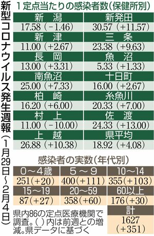 新潟県は2月8日、県内86の定点医療機関から1月29日〜2月4日の1週間に報告された新型コロナウイルスの感染者が1627人で、1医療機関当たりの平均は18・92人だったと発表した。前週(1月22〜28日)の14・84人から1・27倍となり、4週連続で増加した。