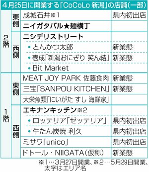 JR東日本新潟シティクリエイト(新潟市中央区)は2月8日、新潟駅に整備中の商業施設「CoCoLo新潟」を4月25日にグランドオープンすると発表した。5月29日に開業する店舗を含め約60店舗も追加公表し、県内企業のほか全国チェーンの衣料品、飲食店などが入る。
