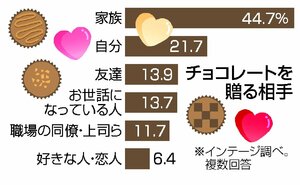 社会 自分へのご褒美 チョコっとぜいたくに♡バレンタイン平均予算3割アップ 「自分チョコ」が人気上昇、職場の「義理チョコ」には後ろ向き・女性意識調査 2024/2/10 18:00 調査会社インテージ(東京)が2月8日発表したバレンタインに関する意識調査で、チョコレートを購入する予定があると回答した女性の平均予算は2023年比34・0%増の5024円だった。自分に贈る「自分チョコ」を買う人は... 残り395文字(全文:502文字) ここから先を読むには 続きを読む(会員登録する) 続きを読む(ログイン) 新潟日報朝刊を購読していますか? はい いいえ トップページで最新情報を見る 関連ニュース 中古車店の車からナンバープレート盗んだ疑い、長岡市の男ら逮捕... 18:45 あなたが望む将来の生き方は?若者や女性の新潟県への定着へ当事... 18:30 孤立、社会との隔絶…新発田市でゲーム依存の背景や影響学ぶ講演... 17:30 省エネやごみの分別…クイズや作品で伝え 新発田市で環境エコカ... 17:00 胎内市で91万羽の殺処分完了、鳥インフル陽性の2養鶏場 16:50 定期便就航へ緊急事態の対応万全に 佐渡市の佐渡空港で消火救難... 16:40 ずっと愛される母校を願って 佐渡市の赤泊小で創立150年記念... 16:20 [クマ目撃情報]長岡市、南魚沼市、村上市、阿賀町、新発田市、... 16:15 合言葉はJND!自転車ぬすませない大作戦! 新潟市西区で盗難... 15:40 創立者・下田歌子の理念と功績語る 新潟青陵学園が125周年行... 14:40 目指せ!水難救助のスペシャリスト! 新潟市中央区で第9管区海... 14:20 新聞読むと新たな発見! 小学生新聞スクラップコンテスト表彰式... 13:40