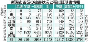 社会 地震・災害 能登半島地震 [能登半島地震]新潟県内の住宅被害1万5902棟、新潟市は1万1158棟(2月9日時点) 2024/2/9 19:30 (最終更新: 2024/2/9 19:31) 能登半島地震による新潟県内の住宅被害は、県のまとめによると、2月9日時点で1万5902棟となり、前日に比べ205棟増えた。県内全体で全壊93棟、半壊2176棟、一部破損1万3619棟となった。 新潟市では1万1158棟の被害が確認され、全壊86棟、半壊2104棟、一部破損8968棟となった。市に寄せられた罹災(りさい)証明の申請件数は1万2317件で、このうち交付したのは2796件。住宅の被害認定調査を終えたのは1万3200棟となった。 トップページで最新情報を見る 関連ニュース [能登半島地震2年]新潟市の再液状化対策見通せず…負担金や同... 2025/12/30 能登半島地震の被災者支援は、西堀ローサ跡地の再活用は…新潟市... 2025/12/24 能登半島地震の義援金受け付けを2027年3月31日まで延長 ... 2025/12/13 [能登半島地震]被災住宅の公費解体、事業完了を新潟市長に報告... 2025/12/9 「夕食難民」を救え! 地震で休業中、佐渡の老舗ホテルが和食居... 2025/12/4 能登半島地震の被災者、避難の教訓語る 糸魚川市で防災講演会 2025/12/3 [能登半島地震]新潟県内の住宅被害2万5415棟に・11月末時点 2025/11/29 [能登半島地震の液状化対策事業]新潟市が地質の詳細調査へ、関... 2025/11/26 [能登半島地震の液状化対策事業]新潟市が自治会別の説明会を開... 2025/11/17 ビニールハウスや車…避難所以外で生活送る被災者への支援強化 ... 2025/11/4 [能登半島地震]新潟県内の住宅被害2万5317棟に・10月末時点 2025/11/1 [能登半島地震の液状化対策事業]自治体単位の説明会、新潟市が... 2025/10/31