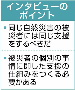 「『同一災害、同一支援の原則』を提唱してきた。自然災害では自治体の境界にかかわらず、同じ支援をすべきだと考える。そもそも被災者生活再建支援...