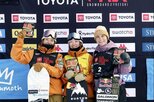 女子ハーフパイプで優勝した小野光希(中央)と3位の冨田せな(右)=カルガリー(Buchholz@fissnowboard)