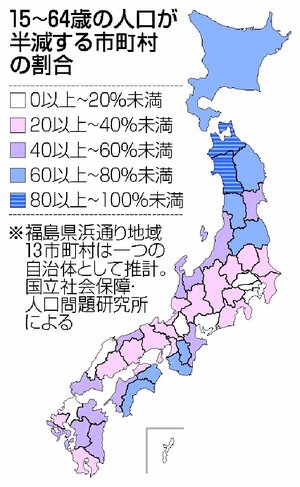 厚生労働省の国立社会保障・人口問題研究所(社人研)が公表した地域別推計人口で、2050年時点の15〜64歳の生産年齢人口労働力の中核を担う15〜64歳の人口。1945年の終戦以降は一貫して増加し、国勢調査によるとピークに達した95年は8716万人で、総人口の69・5%を占めた。その後は少子高齢化の進行に伴い減少し、総務省の人口推計によると、2022年は7421万人、割合は59・4%に低下した。都道府県別に見ると、東京がトップの66・3%だった一方、秋田が最も低い52・1%で、島根と高知がともに53・3%と続いた。を20年と比べたところ、699市町村が半数未満に減ることが2月11日、分かった。共同通信が公表データを分析した。全市区町村の4割に当たり、地方の小規模自治体の落ち込みが目立つ。横ばいか、増加するのは千葉県や東京都などの19市区町村にとどまった。
