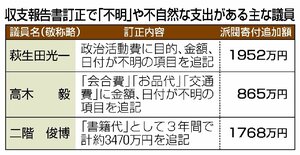 自民党派閥の政治資金パーティー裏金事件自民党の一部派閥で、議員側がパーティー券の販売ノルマを超えて集めた分を政治資金収支報告書に正確に記載していなかったとされる政治資金規正法違反事件。東京地検特捜部は1月、安倍派から多額の還流を受けた国会議員3人ら計10人を立件した。岸田派、二階派の元会計責任者らも含まれる。事件を受け、自民は政治刷新本部を設置し、改革に向けた中間報告をまとめた。安倍、岸田、二階、森山の各派が解散方針を決定した。を巡る各国会議員による政治資金収支報告書政治団体の1月1日から12月31日までの収入と支出、保有資産を記した報告書。政治資金規正法が作成と公表を義務付けており、3年間閲覧できる。政党や政治資金団体、複数の都道府県で活動する政治団体は総務大臣に、一つの都道府県で活動する団体は都道府県選挙管理委員会に提出する。年間5万円を超える寄付(献金)や政治資金パーティーで20万円超の支払いを受けた相手の氏名や金額なども記載。100万円超の貸付金や借入金も記入する必要がある。の訂正で、派閥から高額の還流などを受けた議員に金額や日付を「不明」とする支出の計上があり、国会で野党の追及が強まっている。識者は「民間企業ならあり得ない」と指摘する。