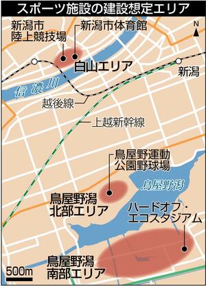 新潟市にふさわしいスポーツ施設の在り方について議論を進めてきた「市スポーツ施設の未来構想会議」は、3月末をめどに中原八一市長に提出する提言書案をまとめた。建て替え方針の鳥屋野運動公園野球場(中央区)については、鳥屋野潟南部エリアへの移転を提案する=地図参照=。2月13日の会議では委員から、能登半島地震により施設が使えなくなっている現状を踏まえ、早急に検討すべきとの意見が出た。